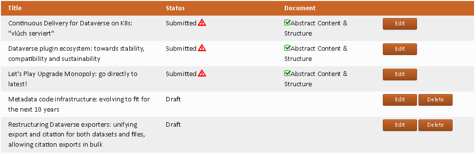 So far, we have officially registered the Documentation WG meeting. We now need the organizers for Containerization and pyDataverse to send over their proposals and, crucially, the list of in-person attendees. The Sensitive Data and Large Data groups are also very welcome to submit their proposals as soon as possible.