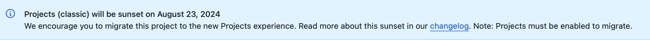 A message is displayed on the classic project board which says that classic board will sunsetting august 23.