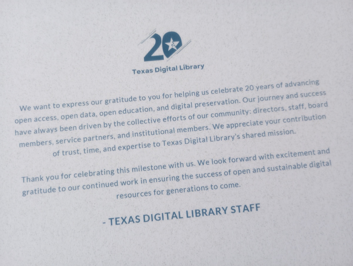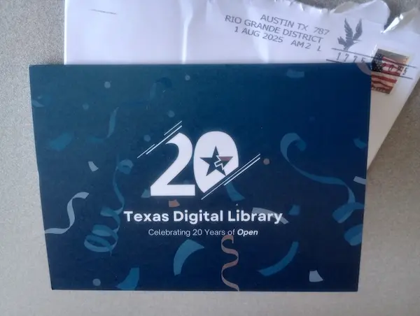 Aw, a very nice card from Texas Digital Library as they celebrate their 20 year anniversary! Thanks! :heart: And congratulations! :tada: