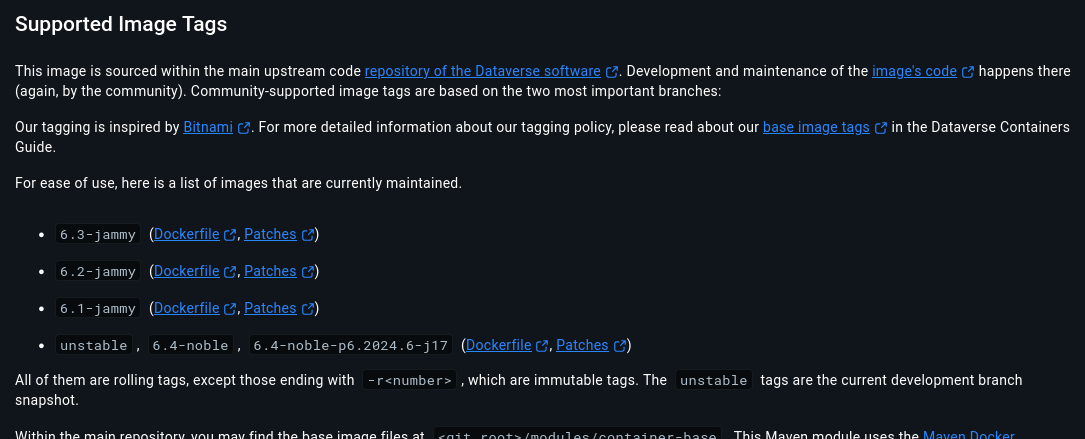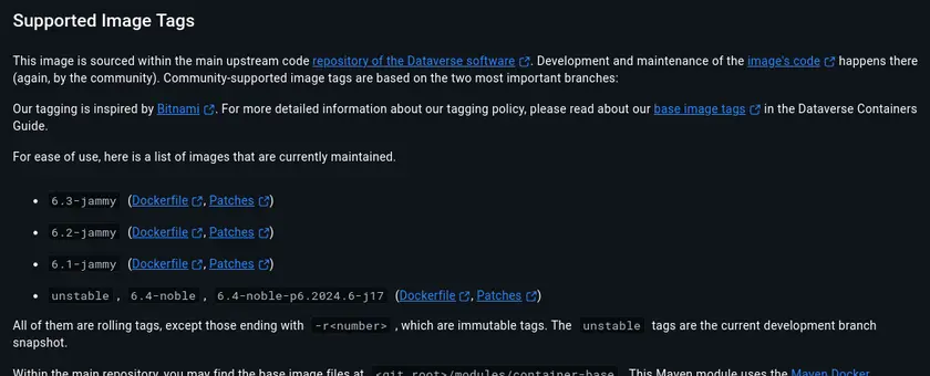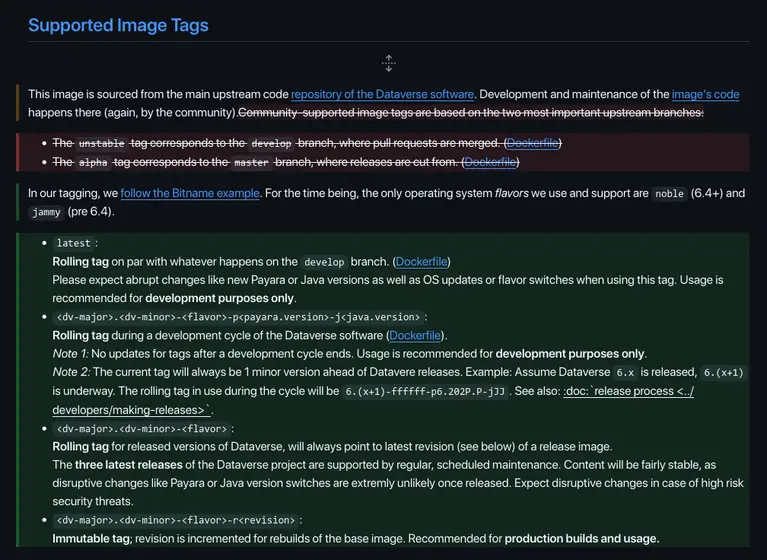 I merged your PR @Philip Durbin π and tweaked the docs some more. Here's the preview: https://dataverse-guide--10827.org.readthedocs.build/en/10827/container/base-image.html#supported-image-tags