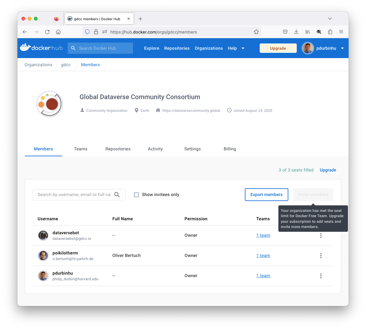 We might have a problem, however. We can only have three members of the gdcc org with the free plan. When I try to invite more members I see "Your organization has met the seat limit for Docker Free Team. Upgrade your subscription to add seats and invite more members."