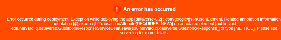 |SEVERE| ERROR StatusLogger Log4j2 could not find a logging implementation. Please add log4j-core to the classpath. Using SimpleLogger to log to the console.|INFO| No deployment transformer implementation found.|WARNING| expected resource not found: /META-INF/javamail.default.address.map|INFO| PER01003: Deployment encountered SQL Exceptions: PER01000: Got SQLException executing statement "ALTER TABLE fileaccessrequests ADD CONSTRAINT FK_fileaccessrequests_DATAFILE_ID FOREIGN KEY (DATAFILE_ID) REFERENCES DVOBJECT (ID)": org.postgresql.util.PSQLException: ERROR: constraint "fk_fileaccessrequests_datafile_id" for relation "fileaccessrequests" already exists