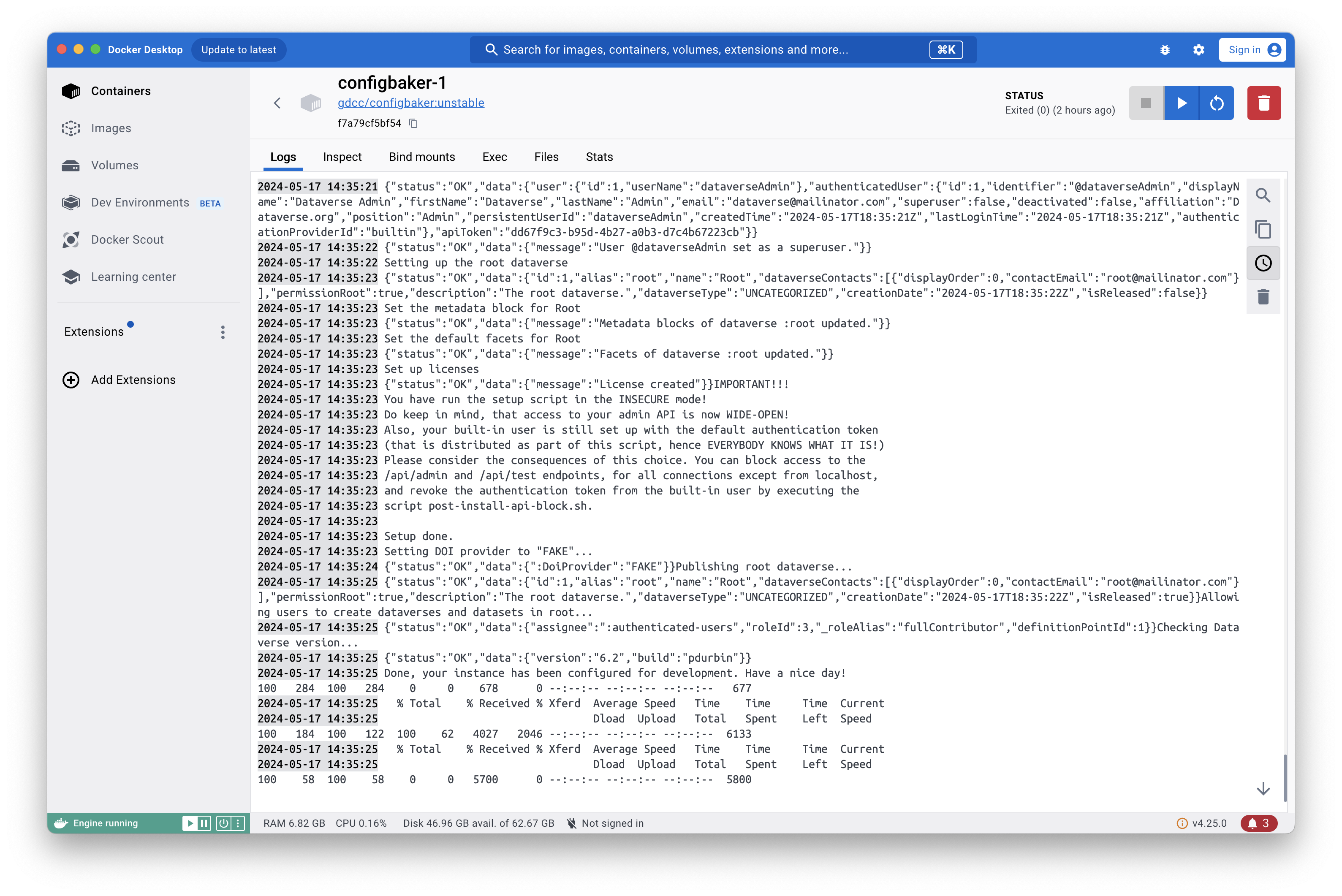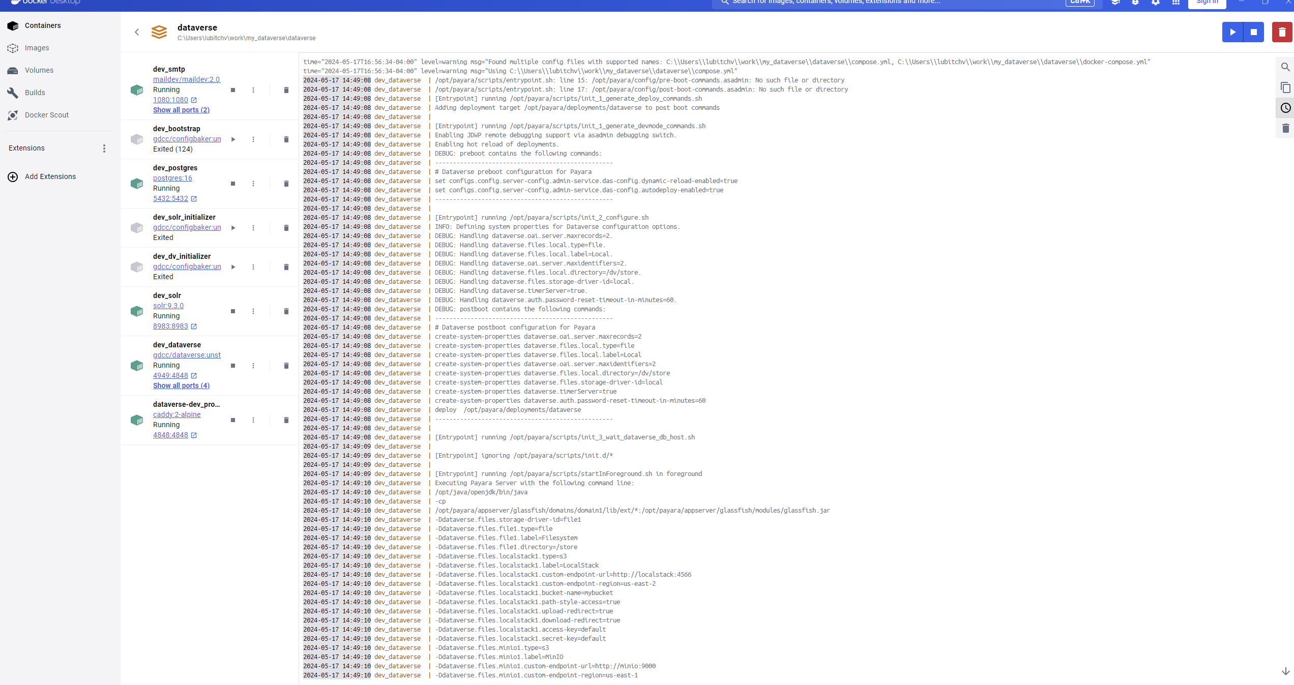 Configbaker I see on docker images. dataverse container has dev_smtp, dev_bootstrap (not running) , dev_postgres, dev_solr_initializer (not running), dev_dv_initializer (not running), dev_solr, dev_dataverse and dataverse-dev-proxy1