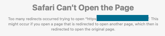 The message in the browser is (depending on which I use, but the error is the same): Load cannot follow more than 20 redirections. In Chrome it's "redirected you too many times".
