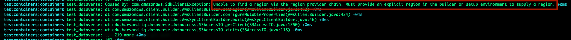 When I run the containers and Dataverse tries to access S3ย an SdkClientException is thrown, describing that it could not find the region