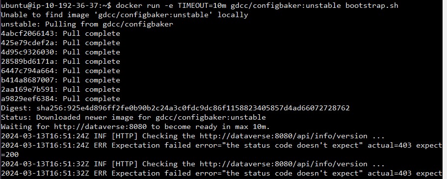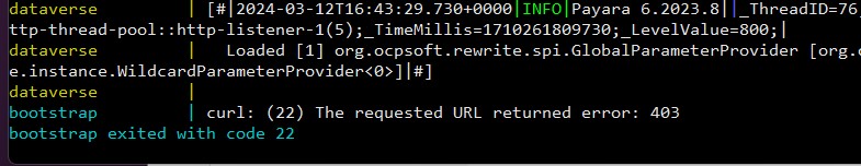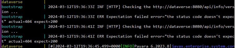 Ok, thanks because I'm seeing bootstrap | 2024-03-12T20:47:14Z ERR Expectation failed error="timed out while making an http call, caused by: Get \"http://dataverse:8080/api/info/version\": context deadline exceeded (Client.Timeout exceeded while awaiting headers)" timeout=3s followed by Dataverse continuing to try to deploy.