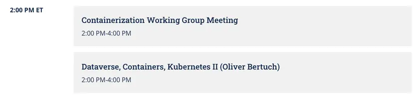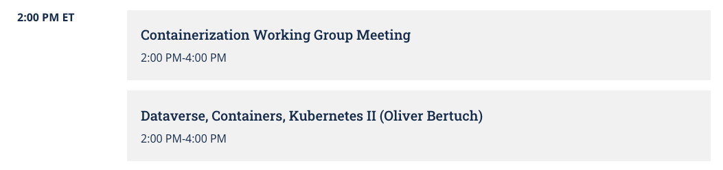 So! I just talked to Stefano and we're planning on switching the container meetings from weekly to monthly. Containerization is still very important to us but we've got lots of priorities, including the rewrite of the Dataverse frontend.