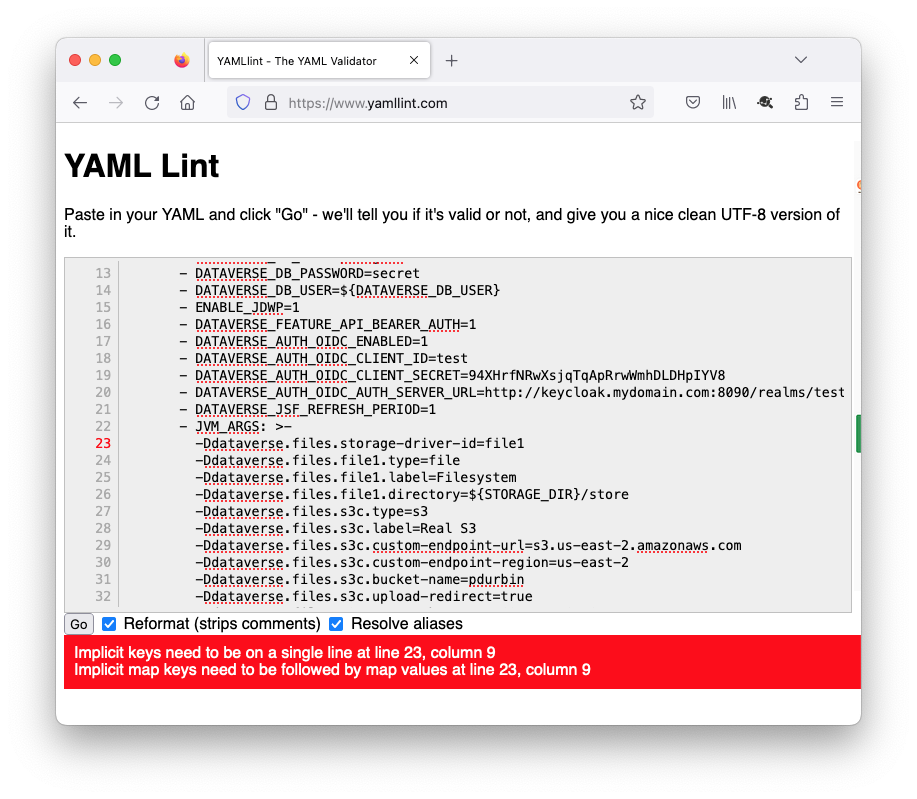 Guess it was the space in the label (- dataverse_files_s3c_label=Real S3) in your case, which caused an error.