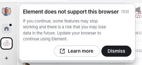 Wow, I was just looking at a message in Matrix and learned that my browser, Firefox, isn't even supported: