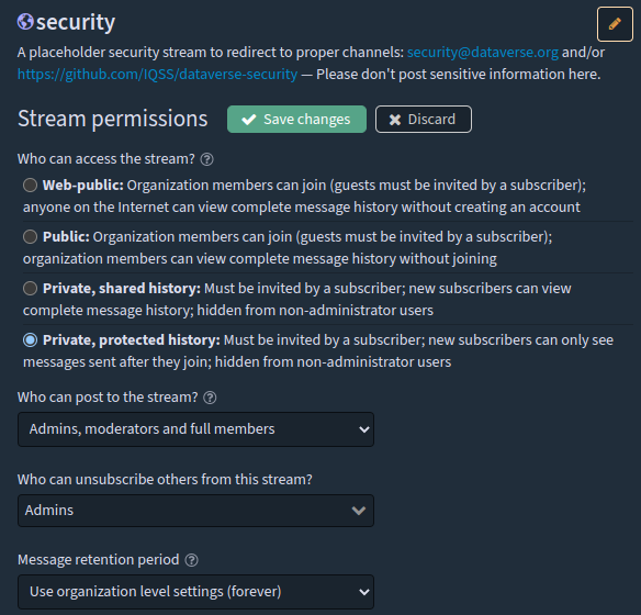"A placeholder security stream to redirect to proper channels: security@dataverse.org and/or https://github.com/IQSS/dataverse-security โ Please don't post sensitive information here."