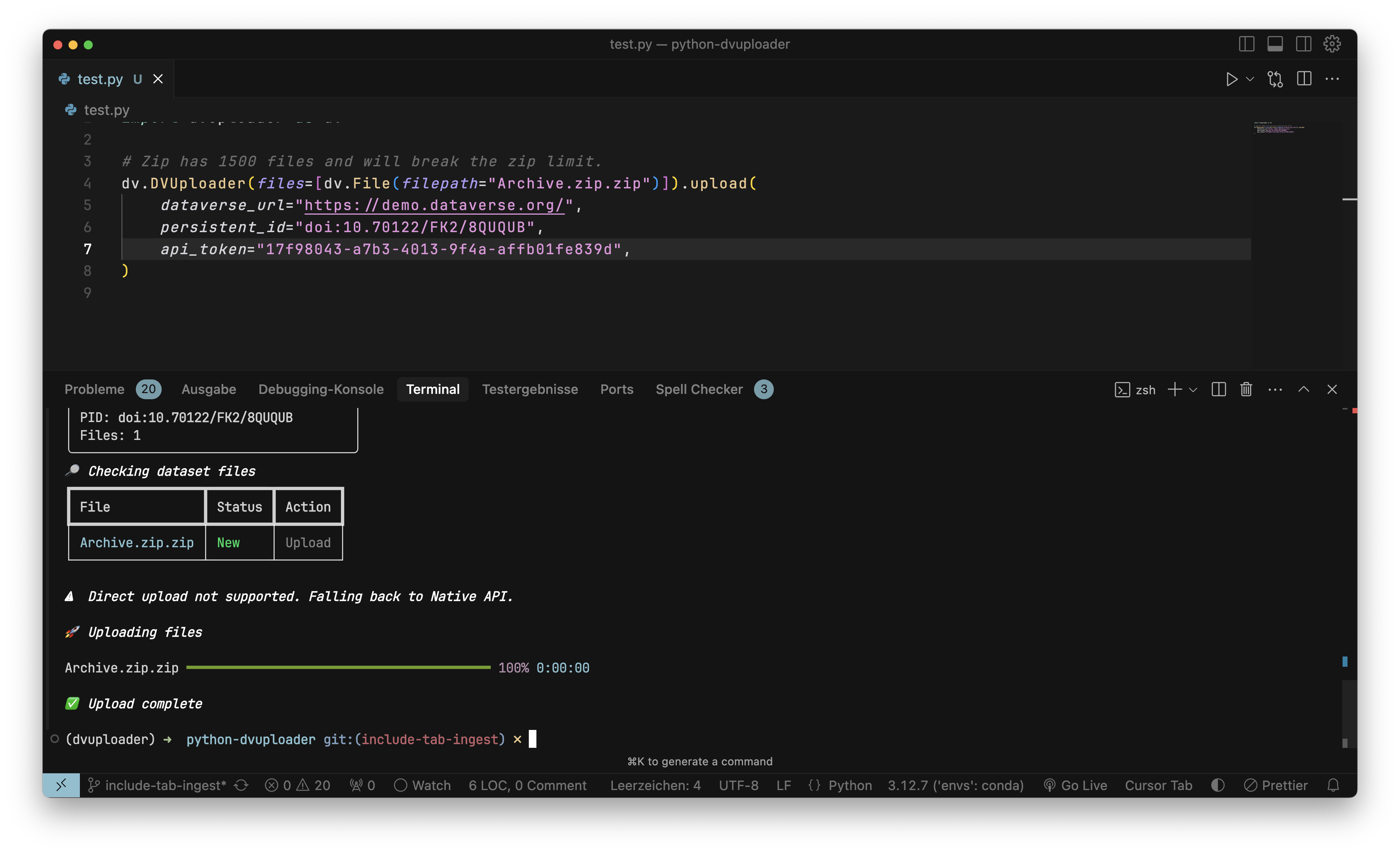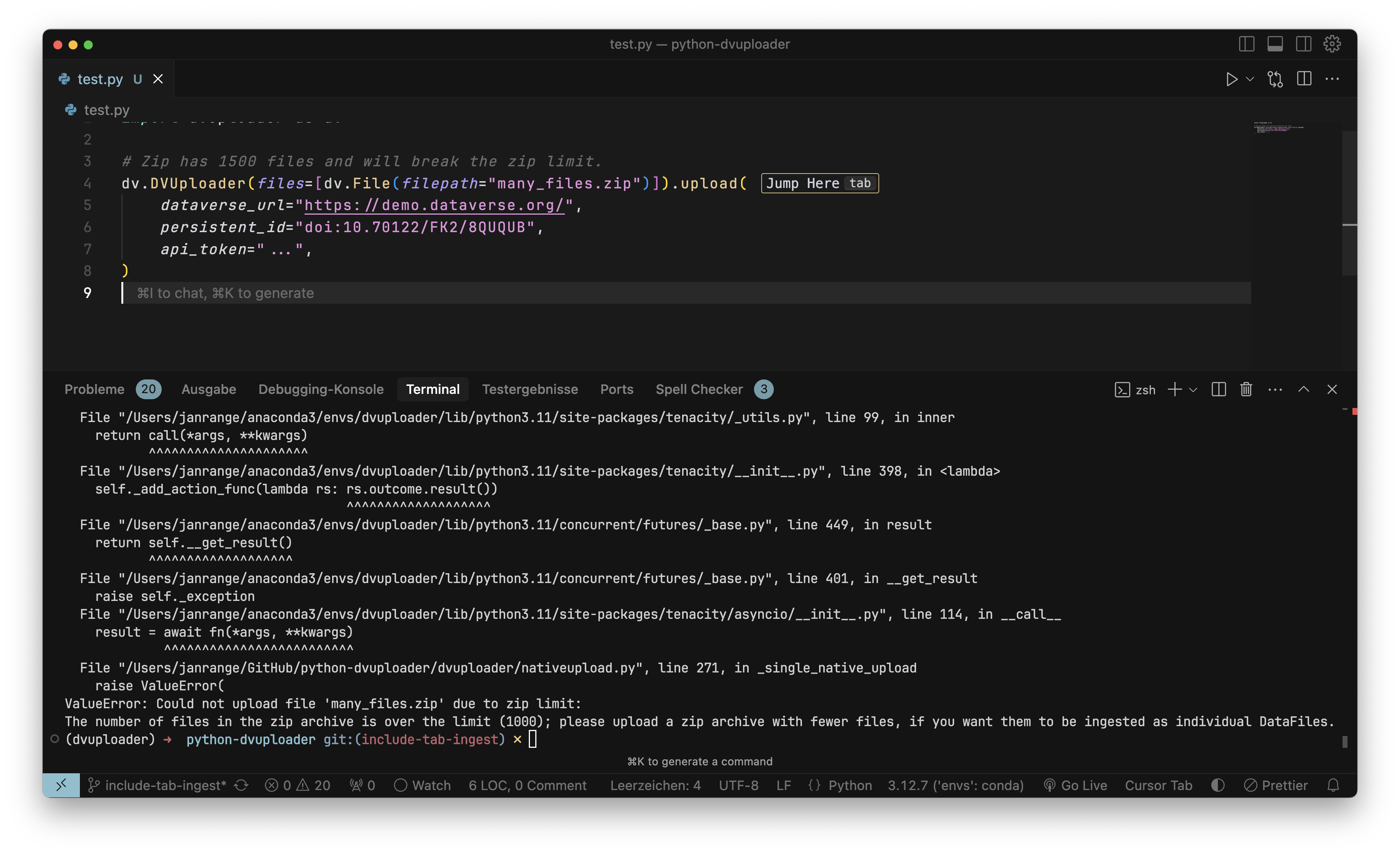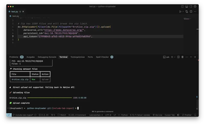 i've been starting to use python-dvuploader's cli for most of our uploads, and i'm running into an issue for zip files that have been "double-zipped" to workaround cases where a zip file in the data set contains more files than the dataverse limit. the upload seems to succeed, but results in an error like ValueError: ('File DXXFAM.zip.zip not found in Dataverse repository.', 'This may be due to the file not being uploaded to the repository:').