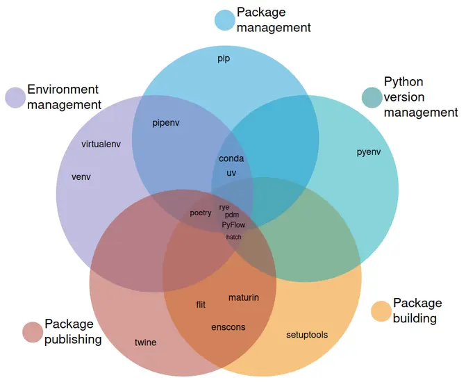 Wow, I just saw this crazy Venn diagram from https://alpopkes.com/posts/python/packaging_tools/ in some slides from @Yamil Suarez