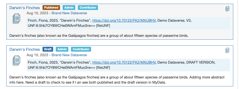 I expected to see both the published and DRAFT version of a dataset in MyData - like image below on Demo Dataverse (so so maybe it was fixed in V6), but I only see the published version in my local Dataverse repo (V5.14) - I have to go to the dataset and look under the "Version" tab to get to the draft: