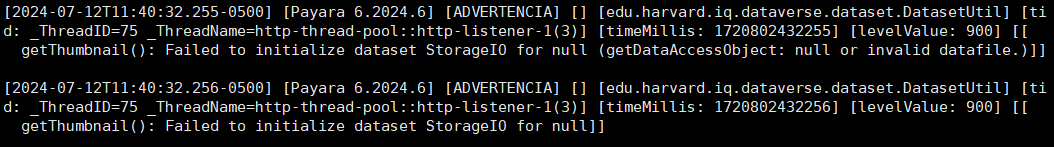 [2024-07-11T14:04:13.571-0500] [Payara 6.2024.6] [ADVERTENCIA] [] [edu.harvard.iq.dataverse.dataset.DatasetUtil] [tid: _ThreadID=76 _ThreadName=http-thread-pool::http-listener-1(4)] [timeMillis: 1720724653571] [levelValue: 900] [[