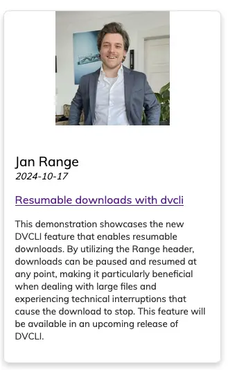 This demonstration showcases the new DVCLI feature that enables resumable downloads. By utilizing the Range header, downloads can be paused and resumed at any point, making it particularly beneficial when dealing with large files and experiencing technical interruptions that cause the download to stop. This feature will be available in an upcoming release of DVCLI.