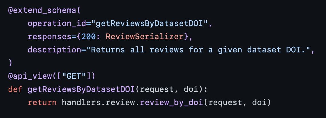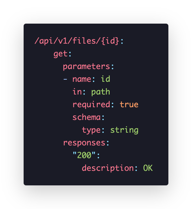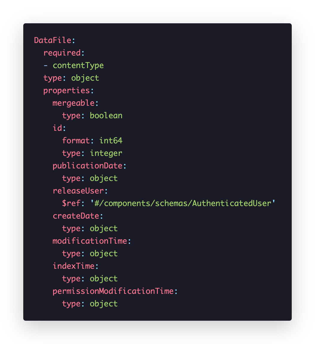 This is the same for response bodies. For instance, the file retrieval path api/v1/files/{id} should return the DataFile object defined in schemas, but it is not referenced.