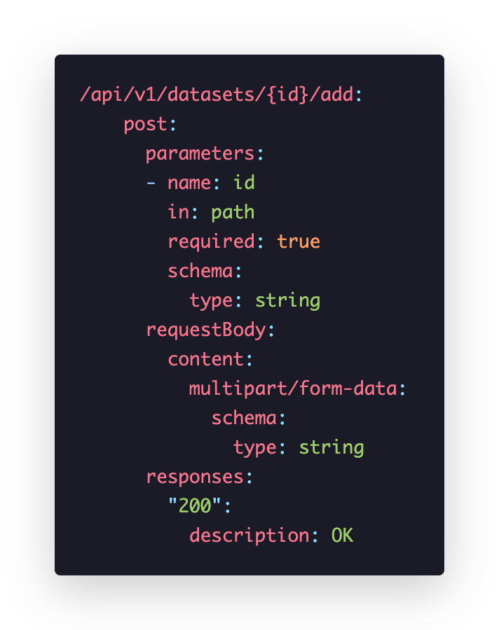 For instance, the path api/v1/datasets/{id}/add already contains the information that multipart/form-data is expected, which is great, but the schema only expects a string although it should be at least jsonData and file.