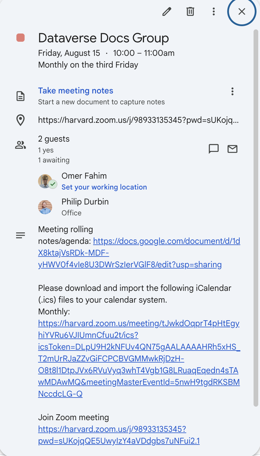 @Omer M Fahim @Philip Durbin 🚀 the Google Calendar Item still has Google Meet in it. As it seems we replaced it with Zoom, should that be updated? Also, as we agreed to do rolling docs from now on, should we add a link to the notes doc in the event?